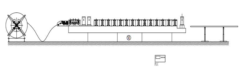 Decoiler→Feeding Guide→Pre-Punching Device→Roll Forming System→Hydraulic Post Cutting Device→Exit Rack(Independent Post Punching Device)