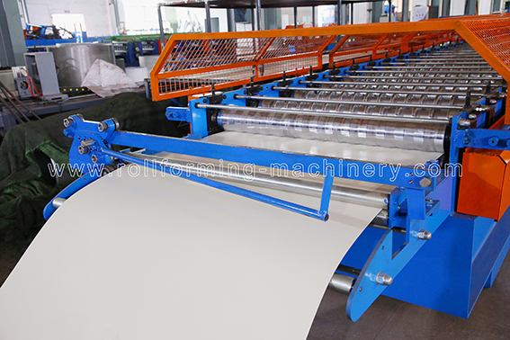 Roll Forming Mill (with Protecting Cover ) → Hydraulic Post Cutting Device(two pieces cutter from blanking ) → Exit Rack*3 → PLC Control System → Hydraulic Station