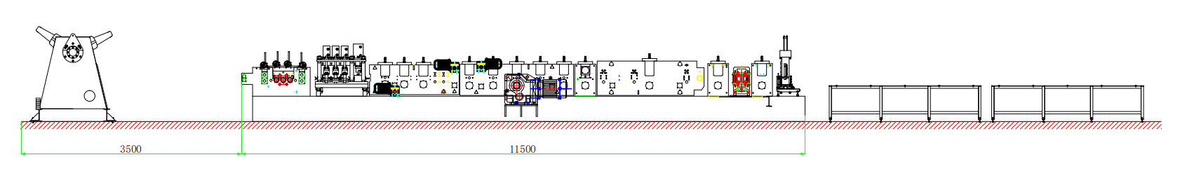 Decoiler→Feeding and Leveling Device→Hydrualic Pre-Cutting & Punching Device→Rolling Forming System→Hydraulic Post Cutting→Exit Rack