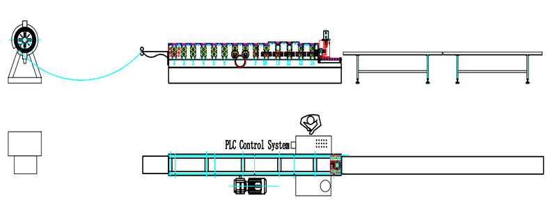 Decoiler→Guide Feeding→Roll Forming System→Hydraulic Post Cutter→Exit Rack